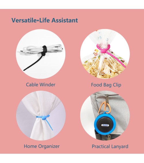Der Drehverschluss aus Silikon ist perfekt, um die Snack-Tasche zu versiegeln und sie länger aufzubewahren. Kann auch Ihren Schreibtisch, Ihre Schubladen, Ihren Werkzeugkasten, Ihre Mülltüte, Ihren Kabelaufroller oder jeden anderen Raum verwalten und diese unordentlichen Kopfhörerkabel, Datenkabel und andere Gegenstände ordentlicher machen.