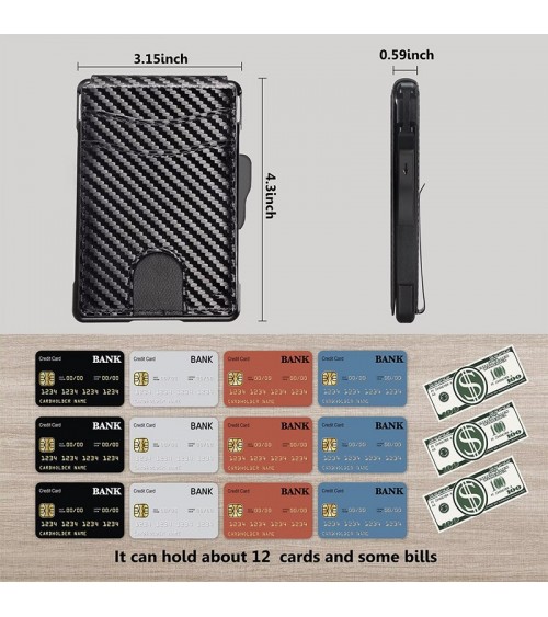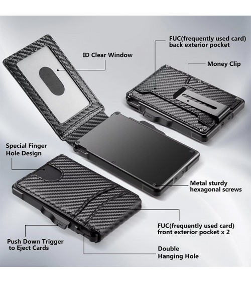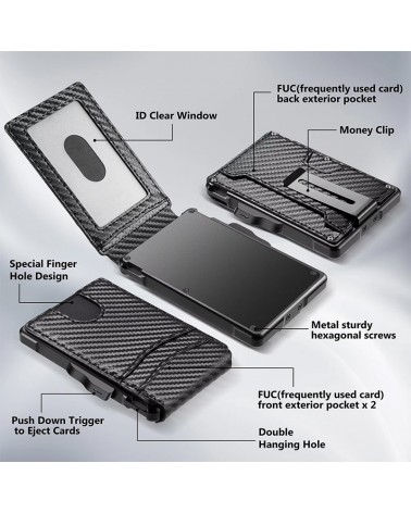 Around 12 cards can be inserted into this lightweight, compact aluminum wallet, with a further 3-4 cards (1 ID window included) in the polyurethane cover, a further 6 cards can be stored in the wallet's aluminum champion, 1 or 2 cards can be inserted on the outside of the aluminum champion.