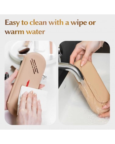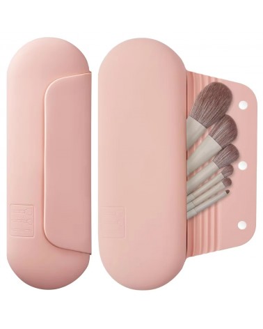 This portable travel make-up brush storage bag is made of silicone, with a foldable design and elegant appearance. It's perfect for organizing cosmetics during travel or outdoor activities. The buckle closure ensures secure storage, while its compact size makes it easy to carry.