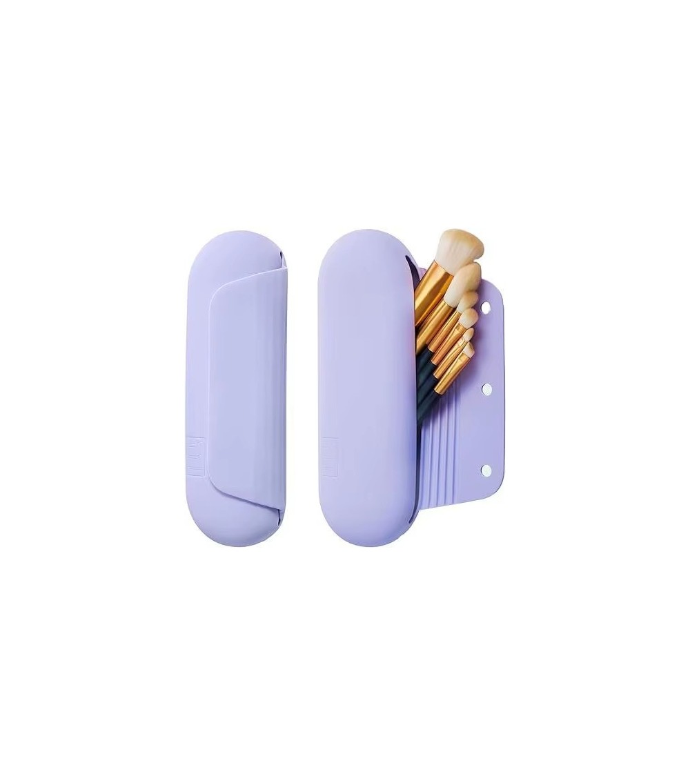 This portable travel make-up brush storage bag is made of silicone, with a foldable design and elegant appearance. It's perfect for organizing cosmetics during travel or outdoor activities. The buckle closure ensures secure storage, while its compact size makes it easy to carry.