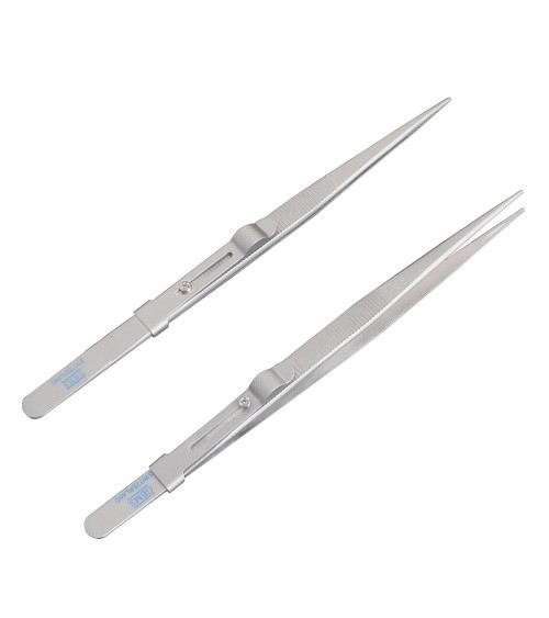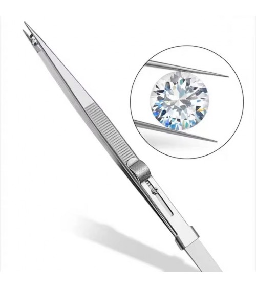 These stainless steel jewelry and gemstone pliers feature a sliding-lock design with a finely serrated tip, ensuring stability and precision when handling small objects such as gemstones.