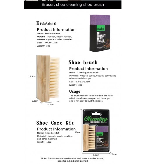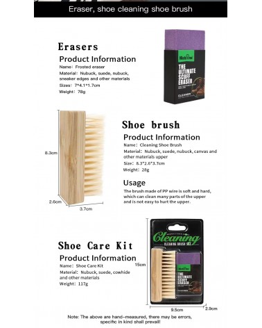 La brosse à chaussures et l’effaceur conviennent aux chaussures en daim, en nubuck et en toile, mais peuvent également être utilisés pour d’autres matériaux tels que le cuir ou le similicuir .