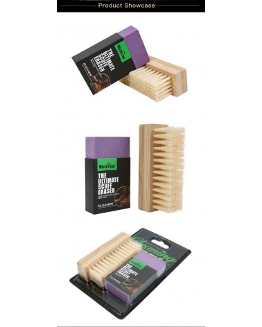 La brosse est en bois et possède donc un manche robuste. Les poils sont en nylon et ont suffisamment de résistance pour nettoyer votre chaussure. La gomme est en caoutchouc et a un boîtier en carton, de sorte qu’elle n’attrape pas d’autres salissures.